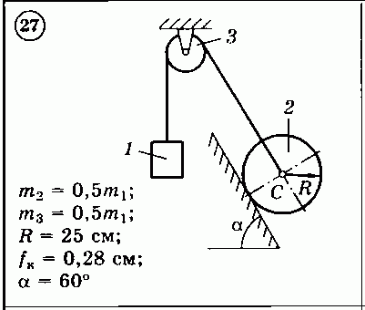 Для приведенных на схемах 1-30 механических систем, используя теорему об изменении кинетической энергии в интегральной форме, определить угловую скорость (варианты 4, 6, 7, 9, 11, 18, 25, 26, 28) или линейную скорость (остальные варианты) тела 1 после его заданного перемещения Фи1 = 2пи рад или S1 = 2 м. Движение начинается из состояния покоя.