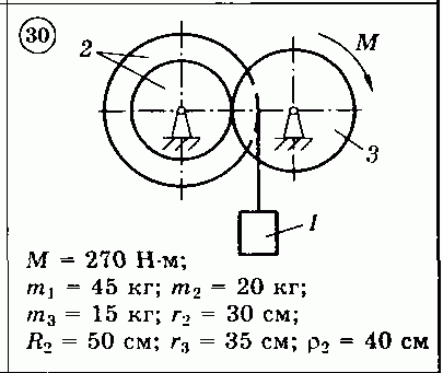 Для приведенных на схемах 1-30 механических систем, используя теорему об изменении кинетической энергии в интегральной форме, определить угловую скорость (варианты 4, 6, 7, 9, 11, 18, 25, 26, 28) или линейную скорость (остальные варианты) тела 1 после его заданного перемещения Фи1 = 2пи рад или S1 = 2 м. Движение начинается из состояния покоя.