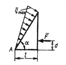 На каком расстоянии d нужно приложить силу F = 100Н, для того чтобы линия дейст­вия равнодействующей этой силы и распреде­ленной нагрузки интенсивностью qmax = 3 Н/м прошла через точку А, если расстояние l = 10м, угол α=60°? (Ответ 4,0)