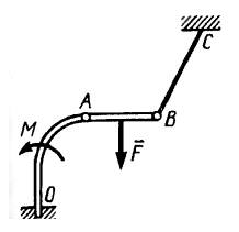 Система тел состоит из стержней ОА, АВ и троса ВС. Какое минимальное число уравнений равновесия необходимо составить для опреде­ления реакций в заделке О, шарнире А и тро­се ВС? (Ответ 6)