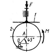 На толкатель 1 кулачкового механизма действует сила F = 100Н. При каком моменте М пары сил, приложенных к кулачку 2, воз­можно равновесие механизма, если расстояние ОА = 10 см. (Ответ 7,07)