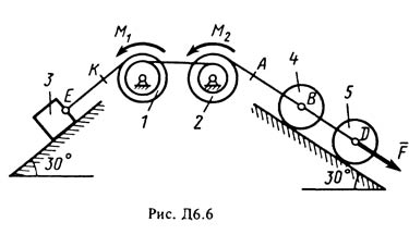 На систему кроме сил тяжести действуют сила F. приложенная к телу 4 или 5 (если тело 5 в систему не входит, сила приложена в точке В к тележке), и пары сил с моментами М1 и М2, приложенные к блокам (при М < 0 направление момента противоположно показанному на рисунке). На участке нити, указанном в таблице в столбце Пружина;, включена пружина с коэффициентом жесткости с (например, если в столбце стоит АВ, то участок АВ является пружиной, если AD то AD пружина, и т.д.); в начальный момент времени пружина не деформирована. Составить для системы уравнения Лагранжа и определить из них частоту и период колебаний, совершаемых телами системы при ее движении.