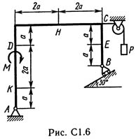 Жесткая рама, расположенная в вертикальной плоскости (рис. С1.0 — С1.9, табл. С1), закреплена в точке А шарнирно, а в точке В прикреплена или к невесомому стержню с шарнирами на концах, или к шарнирной опоре на катках. В точке С к раме привязан трос, перекинутый через блок и несущий на конце груз весом Р = 25 кН. На раму действуют пара сил с моментом М = 100 кН·м и две силы, значения, направления и точки приложения которых указаны в таблице (например, в условиях № 1 на раму действует сила F2 под углом 15° к горизонтальной оси, приложенная в точке D и сила F3 под углом 60° к горизонтальной оси, приложенная в точке E, и т. д.). Определить реакции связей в точках A, В, вызываемые действующими нагрузками. При окончательных расчетах принять а = 0,5 м.