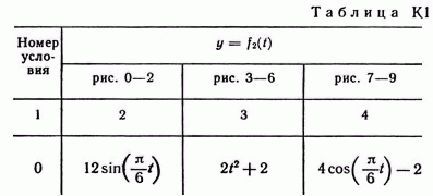 Зависимость x = f1(t) указана непосредственно на рисунках, а зависимость y = f2 дана в табл. K1 (для рис. 0—2 в столбце 2, для рис. 3—6 в столбце 3, для рис. 7—9 в стол
