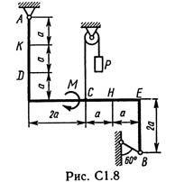 Жесткая рама, расположенная в вертикальной плоскости (рис. С1.0 — С1.9, табл. С1), закреплена в точке А шарнирно, а в точке В прикреплена или к невесомому стержню с шарнирами на концах, или к шарнирной опоре на катках. В точке С к раме привязан трос, перекинутый через блок и несущий на конце груз весом Р = 25 кН. На раму действуют пара сил с моментом М = 100 кН·м и две силы, значения, направления и точки приложения которых указаны в таблице (например, в условиях № 1 на раму действует сила F2 под углом 15° к горизонтальной оси, приложенная в точке D и сила F3 под углом 60° к горизонтальной оси, приложенная в точке E, и т. д.). Определить реакции связей в точках A, В, вызываемые действующими нагрузками. При окончательных расчетах принять а = 0,5 м.