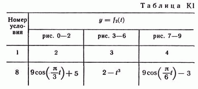 Зависимость x = f1(t) указана непосредственно на рисунках, а зависимость y = f2 дана в табл. K1 (для рис. 0—2 в столбце 2, для рис. 3—6 в столбце 3, для рис. 7—9 в столбце 4)."