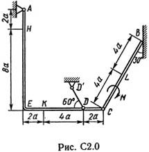 Конструкция состоит из жесткого угольника и стержня, которые в точке С или соединены друг с другом шарнирно (рис. С2.0 — С2.5), или свободно опираются друг о друга (рис. С2.6 — С2.9). Внешними связями, наложенными на конструкцию, являются в точке А или шарнир, или жесткая заделка; в точке В или гладкая плоскость (рис. 0 и 1), или невесомый стержень ВВ´ (рис. 2 и 3), или шарнир (рис. 4—9); в точке D или невесомый стержень DD´ (рис. 0, 3, 8), или шарнирная опора на катках (рис. 7). На каждую конструкцию действуют: пара сил с моментом М = 60 кН·м, равномерно распределенная нагрузка интенсивности q = 20 кН/м и еще две силы. Эти силы, их направления и точки приложения указаны в табл. С2; там же в столбце «Нагруженный участок» указано, на каком участке действует распределенная нагрузка (например, в условиях № 1 на конструкцию действуют сила F2 под углом 60° к горизонтальной оси, приложенная в точке L, сила F4 под углом 30° к горизонтальной оси, приложенная в точке Е, и нагрузка, распределенная на участке СK). Определить реакции связей в точках А, В, С (для рис. 0, 3, 7, 8 еще и в точке D), вызванные заданными нагрузками. При окончательных расчетах принять а = 0,2 м.