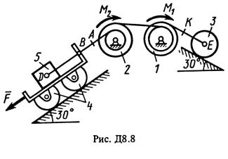 На систему кроме сил тяжести действуют сила F. приложенная к телу 4 или 5 (если тело 5 в систему не входит, сила приложена в точке В к тележке), и пары сил с моментами М1 и М2, приложенные к блокам (при М < 0 направление момента противоположно показанному на рисунке).