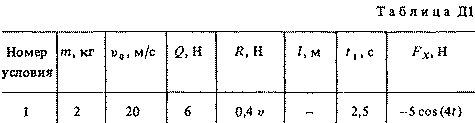 Груз D массой m, получив в точке А начальную скорость v0, движется в изогнутой трубе ABC, расположенной в вертикальной плоскости; участки трубы или оба наклонные, или один горизонтальный, а другой наклонный (рис. Д1.0-Д1.9 табл. Д1). На рисунке АВ на груз кроме силы тяжести действуют постоянная сила Q (ее направление показано на рисунках) и сила сопротивления среды R, зависит от скорости груза v (направлена против движения).