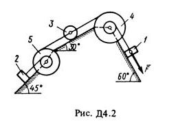 Под действием силы F = f(x), зависящей от перемещения точки приложения силы, система приходит в движение из состояния покоя. При движении системы на шкивы 4 и 5 действуют постоянные моменты сил сопротивлений, равные соответственно M4 и M5.