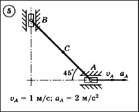 Для приведенного на схеме механизма, состоящего из шатуна AB длиной 2 м и двух ползунов, по заданным величинам скорости и ускорения ползуна A определить скорость и ускорение ползуна B и средней точки C шатуна, а также угловую скорость и угловое ускорение шатуна.