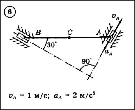 Для приведенного на схеме механизма, состоящего из шатуна AB длиной 2 м и двух ползунов, по заданным величинам скорости и ускорения ползуна A определить скорость и ускорение ползуна B и средней точки C шатуна, а также угловую скорость и угловое ускорение шатуна.