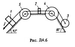 Механическая система состоит из грузов 1 и 2 (коэффициент трения грузов о плоскость f = 0,1), цилиндрического сплошного однородного катка 3 и ступенчатых шкивов 4 и 5 с радиусами ступеней R4 = 0,3 м, r4 = 0,1 м, R5 = 0,2 м, r5 = 0,1 м (массу каждого шкива считать равномерно распределенной по его внешнему ободу) (рис. Д4.0-Д4.9, табл. Д4). Тела системы соединены друг с другом нитями, намотанными на шкивы; участки нитей параллельны соответствующим плоскостям.