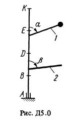 Вертикальный вал AK (рис. Д5.0-Д5.9, табл. Д5), вращающийся с постоянной угловой скоростью ω = 10 с-1, закреплен подпятником в точке А и цилиндрическим подшипником в точке, указанной в табл. Д5 в столбце 2 (AB = BD = DE = EK = b). К валу жестко прикреплены невесомый стержень 1 длиной l1 = 0,4 м с точечной массой m1 = 6 кг на конце и однородный стержень 2 длиной l2 = 0,6 м, имеющий массу m2 = 4 кг; оба стержня лежат в одной плоскости. Точки крепления стержней к валу указаны в таблице в столбцах 3 и 4, а углы α и β – в столбцах 5 и 6.