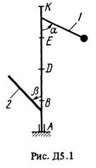 Вертикальный вал AK (рис. Д5.0-Д5.9, табл. Д5), вращающийся с постоянной угловой скоростью ω = 10 с-1, закреплен подпятником в точке А и цилиндрическим подшипником в точке, указанной в табл. Д5 в столбце 2 (AB = BD = DE = EK = b). К валу жестко прикреплены невесомый стержень 1 длиной l1 = 0,4 м с точечной массой m1 = 6 кг на конце и однородный стержень 2 длиной l2 = 0,6 м, имеющий массу m2 = 4 кг; оба стержня лежат в одной плоскости. Точки крепления стержней к валу указаны в таблице в столбцах 3 и 4, а углы α и β – в столбцах 5 и 6.