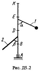 Вертикальный вал AK (рис. Д5.0-Д5.9, табл. Д5), вращающийся с постоянной угловой скоростью ω = 10 с-1, закреплен подпятником в точке А и цилиндрическим подшипником в точке, указанной в табл. Д5 в столбце 2 (AB = BD = DE = EK = b). К валу жестко прикреплены невесомый стержень 1 длиной l1 = 0,4 м с точечной массой m1 = 6 кг на конце и однородный стержень 2 длиной l2 = 0,6 м, имеющий массу m2 = 4 кг; оба стержня лежат в одной плоскости. Точки крепления стержней к валу указаны в таблице в столбцах 3 и 4, а углы α и β – в столбцах 5 и 6.