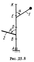 Вертикальный вал AK (рис. Д5.0-Д5.9, табл. Д5), вращающийся с постоянной угловой скоростью ω = 10 с-1, закреплен подпятником в точке А и цилиндрическим подшипником в точке, указанной в табл. Д5 в столбце 2 (AB = BD = DE = EK = b). К валу жестко прикреплены невесомый стержень 1 длиной l1 = 0,4 м с точечной массой m1 = 6 кг на конце и однородный стержень 2 длиной l2 = 0,6 м, имеющий массу m2 = 4 кг; оба стержня лежат в одной плоскости. Точки крепления стержней к валу указаны в таблице в столбцах 3 и 4, а углы α и β – в столбцах 5 и 6.