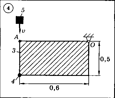 На схемах 1-30 показаны механические системы, состоящие из конструкции и ударяющего по ней тела. Конструкция может вращаться вокруг оси, проходящей через неподвижную точку О. Она состоит из тонких однородных стержней 1 и 2, или однородной пластины 3 и точечных грузов 4. Масса 1 м длины стержней равна 25 кг, масса 1 м2 площади пластины — 50 кг, масса точечного груза — 20 кг. Размеры частей конструкции указаны в метрах.