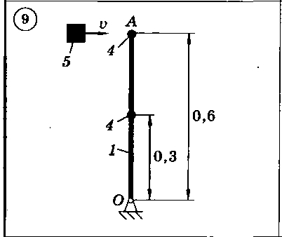 Тело 5 (материальная точка) массой т5 = 30 кг, двигаясь со скоростью v = 4 м/с, ударяется о неподвижную конструкцию в точке А, причем удар является абсолютно неупругим.