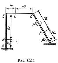 Конструкция состоит из жесткого угольника и стержня, которые в точке С или соединены друг с другом шарнирно (рис. С2.0 — С2.5), или свободно опираются друг о друга (рис. С2.6 — С2.9). Внешними связями, наложенными на конструкцию, являются в точке А или шарнир, или жесткая заделка; в точке В или гладкая плоскость (рис. 0 и 1), или невесомый стержень ВВ´ (рис. 2 и 3), или шарнир (рис. 4—9); в точке D или невесомый стержень DD´ (рис. 0, 3, 8), или шарнирная опора на катках (рис. 7). На каждую конструкцию действуют: пара сил с моментом М = 60 кН·м, равномерно распределенная нагрузка интенсивности q = 20 кН/м и еще две силы. Эти силы, их направления и точки приложения указаны в табл. С2; там же в столбце «Нагруженный участок» указано, на каком участке действует распределенная нагрузка (например, в условиях № 1 на конструкцию действуют сила F2 под углом 60° к горизонтальной оси, приложенная в точке L, сила F4 под углом 30° к горизонтальной оси, приложенная в точке Е, и нагрузка, распределенная на участке СK). Определить реакции связей в точках А, В, С (для рис. 0, 3, 7, 8 еще и в точке D), вызванные заданными нагрузками. При окончательных расчетах принять а = 0,2 м.