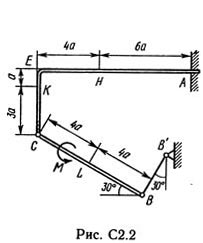 Конструкция состоит из жесткого угольника и стержня, которые в точке С или соединены друг с другом шарнирно (рис. С2.0 — С2.5), или свободно опираются друг о друга (рис. С2.6 — С2.9). Внешними связями, наложенными на конструкцию, являются в точке А или шарнир, или жесткая заделка; в точке В или гладкая плоскость (рис. 0 и 1), или невесомый стержень ВВ´ (рис. 2 и 3), или шарнир (рис. 4—9); в точке D или невесомый стержень DD´ (рис. 0, 3, 8), или шарнирная опора на катках (рис. 7). На каждую конструкцию действуют: пара сил с моментом М = 60 кН·м, равномерно распределенная нагрузка интенсивности q = 20 кН/м и еще две силы. Эти силы, их направления и точки приложения указаны в табл. С2; там же в столбце «Нагруженный участок» указано, на каком участке действует распределенная нагрузка (например, в условиях № 1 на конструкцию действуют сила F2 под углом 60° к горизонтальной оси, приложенная в точке L, сила F4 под углом 30° к горизонтальной оси, приложенная в точке Е, и нагрузка, распределенная на участке СK). Определить реакции связей в точках А, В, С (для рис. 0, 3, 7, 8 еще и в точке D), вызванные заданными нагрузками. При окончательных расчетах принять а = 0,2 м.