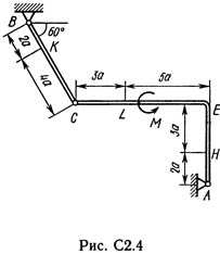 Конструкция состоит из жесткого угольника и стержня, которые в точке С или соединены друг с другом шарнирно (рис. С2.0 — С2.5), или свободно опираются друг о друга (рис. С2.6 — С2.9). Внешними связями, наложенными на конструкцию, являются в точке А или шарнир, или жесткая заделка; в точке В или гладкая плоскость (рис. 0 и 1), или невесомый стержень ВВ´ (рис. 2 и 3), или шарнир (рис. 4—9); в точке D или невесомый стержень DD´ (рис. 0, 3, 8), или шарнирная опора на катках (рис. 7). На каждую конструкцию действуют: пара сил с моментом М = 60 кН·м, равномерно распределенная нагрузка интенсивности q = 20 кН/м и еще две силы. Эти силы, их направления и точки приложения указаны в табл. С2; там же в столбце «Нагруженный участок» указано, на каком участке действует распределенная нагрузка (например, в условиях № 1 на конструкцию действуют сила F2 под углом 60° к горизонтальной оси, приложенная в точке L, сила F4 под углом 30° к горизонтальной оси, приложенная в точке Е, и нагрузка, распределенная на участке СK). Определить реакции связей в точках А, В, С (для рис. 0, 3, 7, 8 еще и в точке D), вызванные заданными нагрузками. При окончательных расчетах принять а = 0,2 м.
