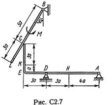 Конструкция состоит из жесткого угольника и стержня, которые в точке С или соединены друг с другом шарнирно (рис. С2.0 — С2.5), или свободно опираются друг о друга (рис. С2.6 — С2.9). Внешними связями, наложенными на конструкцию, являются в точке А или шарнир, или жесткая заделка; в точке В или гладкая плоскость (рис. 0 и 1), или невесомый стержень ВВ´ (рис. 2 и 3), или шарнир (рис. 4—9); в точке D или невесомый стержень DD´ (рис. 0, 3, 8), или шарнирная опора на катках (рис. 7). На каждую конструкцию действуют: пара сил с моментом М = 60 кН·м, равномерно распределенная нагрузка интенсивности q = 20 кН/м и еще две силы. Эти силы, их направления и точки приложения указаны в табл. С2; там же в столбце «Нагруженный участок» указано, на каком участке действует распределенная нагрузка (например, в условиях № 1 на конструкцию действуют сила F2 под углом 60° к горизонтальной оси, приложенная в точке L, сила F4 под углом 30° к горизонтальной оси, приложенная в точке Е, и нагрузка, распределенная на участке СK). Определить реакции связей в точках А, В, С (для рис. 0, 3, 7, 8 еще и в точке D), вызванные заданными нагрузками. При окончательных расчетах принять а = 0,2 м.