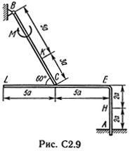 Конструкция состоит из жесткого угольника и стержня, которые в точке С или соединены друг с другом шарнирно (рис. С2.0 — С2.5), или свободно опираются друг о друга (рис. С2.6 — С2.9). Внешними связями, наложенными на конструкцию, являются в точке А или шарнир, или жесткая заделка; в точке В или гладкая плоскость (рис. 0 и 1), или невесомый стержень ВВ´ (рис. 2 и 3), или шарнир (рис. 4—9); в точке D или невесомый стержень DD´ (рис. 0, 3, 8), или шарнирная опора на катках (рис. 7). На каждую конструкцию действуют: пара сил с моментом М = 60 кН·м, равномерно распределенная нагрузка интенсивности q = 20 кН/м и еще две силы. Эти силы, их направления и точки приложения указаны в табл. С2; там же в столбце «Нагруженный участок» указано, на каком участке действует распределенная нагрузка (например, в условиях № 1 на конструкцию действуют сила F2 под углом 60° к горизонтальной оси, приложенная в точке L, сила F4 под углом 30° к горизонтальной оси, приложенная в точке Е, и нагрузка, распределенная на участке СK). Определить реакции связей в точках А, В, С (для рис. 0, 3, 7, 8 еще и в точке D), вызванные заданными нагрузками. При окончательных расчетах принять а = 0,2 м.