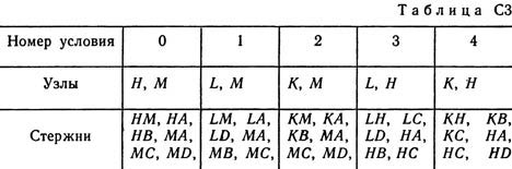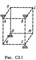 Шесть невесомых стержней соединены своими концами шарнирно друг с другом в двух узлах и прикреплены другими концами (тоже шарнирно) к неподвижным опорам А, В, С, D (рис. СЗ.0 — С3.9, табл. СЗ). Стержни и узлы (узлы расположены в вершинах H, К, L или М прямоугольного параллелепипеда) на рисунках не показаны и должны быть изображены решающим задачу по данным таблицы. В узле, который в каждом столбце таблицы указан первым, приложена сила Р = 200 Н; во втором узле приложена сила Q = 100 Н. Сила Р образует с положительными направлениями координатных осей х, у, z углы, равные соответственно α1 = 45°, β1 = 60°, γ1 = 60°, а сила Q — углы α2 = 60°, β2 = 45°, γ2 = 60°; направления осей х, у, z для всех рисунков показаны на рис. СЗ.0. Грани параллелепипеда, параллельные плоскости ху, — квадраты. Диагонали других боковых граней образуют с плоскостью ху угол φ = 60°, а диагональ параллелепипеда образует с этой плоскостью угол θ = 51°. Определить усилия в стержнях. На рис. С3.10 в качестве примера показано, как должен выглядеть чертеж СЗ. 1, если по условиям задачи узлы находятся в точках L и М, а стержнями являются LM, LA, LB; МА, МС, MD. Там же показаны углы φ и θ.