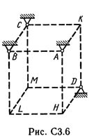 Шесть невесомых стержней соединены своими концами шарнирно друг с другом в двух узлах и прикреплены другими концами (тоже шарнирно) к неподвижным опорам А, В, С, D (рис. СЗ.0 — С3.9, табл. СЗ). Стержни и узлы (узлы расположены в вершинах H, К, L или М прямоугольного параллелепипеда) на рисунках не показаны и должны быть изображены решающим задачу по данным таблицы. В узле, который в каждом столбце таблицы указан первым, приложена сила Р = 200 Н; во втором узле приложена сила Q = 100 Н. Сила Р образует с положительными направлениями координатных осей х, у, z углы, равные соответственно α1 = 45°, β1 = 60°, γ1 = 60°, а сила Q — углы α2 = 60°, β2 = 45°, γ2 = 60°; направления осей х, у, z для всех рисунков показаны на рис. СЗ.0. Грани параллелепипеда, параллельные плоскости ху, — квадраты. Диагонали других боковых граней образуют с плоскостью ху угол φ = 60°, а диагональ параллелепипеда образует с этой плоскостью угол θ = 51°. Определить усилия в стержнях. На рис. С3.10 в качестве примера показано, как должен выглядеть чертеж СЗ. 1, если по условиям задачи узлы находятся в точках L и М, а стержнями являются LM, LA, LB; МА, МС, MD. Там же показаны углы φ и θ.