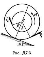 Барабан радиуса R весом P имеет выточку (как у катушки) радиуса r = 0,6R (рис. Д7.0 — Д7.9, табл. Д7). К концам намотанных на барабан нитей приложены постоянные силы F1 и F2, направления которых определяются углом β; кроме сил на барабан действует пара с моментом М; когда в таблице М<0, направление момента противоположно показанному на рисунке. При движении, начинающемся из состояния покоя, барабан катится без скольжения по шероховатой наклонной плоскости с углом наклона α так, как показано на рисунках.