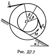 Барабан радиуса R весом P имеет выточку (как у катушки) радиуса r = 0,6R (рис. Д7.0 — Д7.9, табл. Д7). К концам намотанных на барабан нитей приложены постоянные силы F1 и F2, направления которых определяются углом β; кроме сил на барабан действует пара с моментом М; когда в таблице М<0, направление момента противоположно показанному на рисунке. При движении, начинающемся из состояния покоя, барабан катится без скольжения по шероховатой наклонной плоскости с углом наклона α так, как показано на рисунках.
