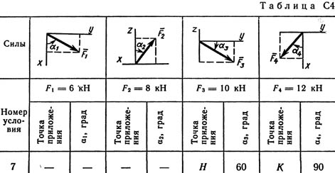 Две однородные прямоугольные тонкие плиты жестко соединены (сварены) под прямым углом друг к другу и закреплены сферическим шарниром (или подпятником) в точке А, цилиндрическим шарниром (подшипником) в точке В и невесомым стержнем 1 (рис. С4.0 — С4.7) или же двумя подшипниками в точках A и В и двумя невесомыми стержнями 1 и 2 (рис. С4.8, С4.9); все стержни прикреплены к плитам и к неподвижным опорам шарнирами. Размеры плит указаны на рисунках; вес большей плиты P1 = 5 кН, вес меньшей плиты P2 = 3 кН. Каждая из плит расположена параллельно одной из координатных плоскостей (плоскость ху — горизонтальная). На плиты действуют пара сил с моментом М = 4 кН·м, лежащая в плоскости одной из плит, и две силы. Значения этих сил, их направления и точки приложения указаны в табл. С4; при этом силы F1 и F4 лежат в плоскостях, параллельных плоскости ху, сила F2 — в плоскости, параллельной xz, и сила F3 — в плоскости, параллельной yz. Точки приложения сил (D, Е, Н, К) находятся в углах или в серединах сторон плит. Определить реакции связей в точках А и В и реакцию стержня (стержней). При подсчетах принять а = 0,6 м.