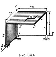 Две однородные прямоугольные тонкие плиты жестко соединены (сварены) под прямым углом друг к другу и закреплены сферическим шарниром (или подпятником) в точке А, цилиндрическим шарниром (подшипником) в точке В и невесомым стержнем 1 (рис. С4.0 — С4.7) или же двумя подшипниками в точках A и В и двумя невесомыми стержнями 1 и 2 (рис. С4.8, С4.9); все стержни прикреплены к плитам и к неподвижным опорам шарнирами. Размеры плит указаны на рисунках; вес большей плиты P1 = 5 кН, вес меньшей плиты P2 = 3 кН. Каждая из плит расположена параллельно одной из координатных плоскостей (плоскость ху — горизонтальная). На плиты действуют пара сил с моментом М = 4 кН·м, лежащая в плоскости одной из плит, и две силы. Значения этих сил, их направления и точки приложения указаны в табл. С4; при этом силы F1 и F4 лежат в плоскостях, параллельных плоскости ху, сила F2 — в плоскости, параллельной xz, и сила F3 — в плоскости, параллельной yz. Точки приложения сил (D, Е, Н, К) находятся в углах или в серединах сторон плит. Определить реакции связей в точках А и В и реакцию стержня (стержней). При подсчетах принять а = 0,6 м.