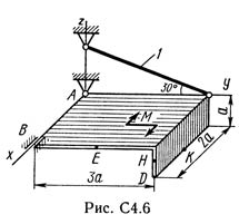 Две однородные прямоугольные тонкие плиты жестко соединены (сварены) под прямым углом друг к другу и закреплены сферическим шарниром (или подпятником) в точке А, цилиндрическим шарниром (подшипником) в точке В и невесомым стержнем 1 (рис. С4.0 — С4.7) или же двумя подшипниками в точках A и В и двумя невесомыми стержнями 1 и 2 (рис. С4.8, С4.9); все стержни прикреплены к плитам и к неподвижным опорам шарнирами. Размеры плит указаны на рисунках; вес большей плиты P1 = 5 кН, вес меньшей плиты P2 = 3 кН. Каждая из плит расположена параллельно одной из координатных плоскостей (плоскость ху — горизонтальная). На плиты действуют пара сил с моментом М = 4 кН·м, лежащая в плоскости одной из плит, и две силы. Значения этих сил, их направления и точки приложения указаны в табл. С4; при этом силы F1 и F4 лежат в плоскостях, параллельных плоскости ху, сила F2 — в плоскости, параллельной xz, и сила F3 — в плоскости, параллельной yz. Точки приложения сил (D, Е, Н, К) находятся в углах или в серединах сторон плит. Определить реакции связей в точках А и В и реакцию стержня (стержней). При подсчетах принять а = 0,6 м.