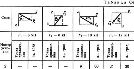 Две однородные прямоугольные тонкие плиты жестко соединены (сварены) под прямым углом друг к другу и закреплены сферическим шарниром (или подпятником) в точке А, цилиндрическим шарниром (подшипником) в точке В и невесомым стержнем 1 (рис. С4.0 — С4.7) или же двумя подшипниками в точках A и В и двумя невесомыми стержнями 1 и 2 (рис. С4.8, С4.9); все стержни прикреплены к плитам и к неподвижным опорам шарнирами. Размеры плит указаны на рисунках; вес большей плиты P1 = 5 кН, вес меньшей плиты P2 = 3 кН. Каждая из плит расположена параллельно одной из координатных плоскостей (плоскость ху — горизонтальная). На плиты действуют пара сил с моментом М = 4 кН·м, лежащая в плоскости одной из плит, и две силы. Значения этих сил, их направления и точки приложения указаны в табл. С4; при этом силы F1 и F4 лежат в плоскостях, параллельных плоскости ху, сила F2 — в плоскости, параллельной xz, и сила F3 — в плоскости, параллельной yz. Точки приложения сил (D, Е, Н, К) находятся в углах или в серединах сторон плит. Определить реакции связей в точках А и В и реакцию стержня (стержней). При подсчетах принять а = 0,6 м.