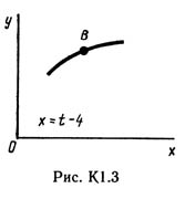Под номером К1 помещены две задачи К1а и К1б, которые надо решить. Задача К1а. Точка В движется в плоскости xy (рис. К1.0 — К 1.9, табл. К1; траектория точки на рисунках показана условно). Закон движения точки задан уравнениями: x = f1(t), y = f2(t), где x и y выражены в сантиметрах, t — в секундах. Найти уравнение траектории точки; для момента времени t1 = 1 с определить скорость и ускорение точки, а также ее касательное и нормальное ускорения и радиус кривизны в соответствующей точке траектории. Зависимость x = f1(t) указана непосредственно на рисунках, а зависимость y = f2(t) дана в табл. K1 (для рис. 0—2 в столбце 2, для рис. 3—6 в столбце 3, для рис. 7—9 в столбце 4). Как и в задачах С1 — С4, номер рисунка выбирается по предпоследней цифре шифра, а номер условия в табл. К1 — по последней. Задача К1б. Точка движется по дуге окружности радиуса R = 2 м по закону s = f(t), заданному в табл. К1 в столбце 5 (s — в метрах, t — в секундах), где s =AM — расстояние точки от некоторого начала A, измеренное вдоль дуги окружности. Определить скорость и ускорение точки в момент времени t1 = 1 с. Изобразить на рисунке векторы v и a, считая, что точка в этот момент находится в положении M, а положительное направление отсчета s — от А к М.
