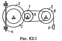 Механизм состоит из ступенчатых колес 1—3, находящихся в зацеплении или связанных ременной передачей, зубчатой рейки 4 и груза 5, привязанного к концу нити, намотанной на одно из колес (рис. К2.0 — К2.9, табл. К2). Радиусы ступеней колес равны соответственно: у колеса 1 – r1 = 2 см, R1 = 4 см, у колеса 2 – r2 = 6 см, R2 = 8 см, у колеса 3 – r3 — 12 см, R3 = 16 см. На ободьях колес расположены точки A, В и С. В столбце «Дано» таблицы указан закон движения или закон изменения скорости ведущего звена механизма, где φ1(t) — закон вращения колеса 1, s2(f) — закон движения рейки 4, ω2(t) — закон изменения угловой скорости колеса 2, v5(t) — закон изменения скорости груза 5 и т. д. (везде φ выражено в радианах, s — в сантиметрах, t — в секундах). Положительное направление для φ и ω против хода часовой стрелки, для s4, s5 и v4, v5 — вниз. Определить в момент времени t1 = 2 с указанные в таблице в столбцах «Найти» скорости (v — линейные, ω — угловые) и ускорения (а — линейные, ε — угловые) соответствующих точек или тел (v5 — скорость груза 5 и т. д.).