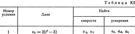 Механизм состоит из ступенчатых колес 1—3, находящихся в зацеплении или связанных ременной передачей, зубчатой рейки 4 и груза 5, привязанного к концу нити, намотанной на одно из колес (рис. К2.0 — К2.9, табл. К2). Радиусы ступеней колес равны соответственно: у колеса 1 – r1 = 2 см, R1 = 4 см, у колеса 2 – r2 = 6 см, R2 = 8 см, у колеса 3 – r3 — 12 см, R3 = 16 см. На ободьях колес расположены точки A, В и С. В столбце «Дано» таблицы указан закон движения или закон изменения скорости ведущего звена механизма, где φ1(t) — закон вращения колеса 1, s2(f) — закон движения рейки 4, ω2(t) — закон изменения угловой скорости колеса 2, v5(t) — закон изменения скорости груза 5 и т. д. (везде φ выражено в радианах, s — в сантиметрах, t — в секундах). Положительное направление для φ и ω против хода часовой стрелки, для s4, s5 и v4, v5 — вниз. Определить в момент времени t1 = 2 с указанные в таблице в столбцах «Найти» скорости (v — линейные, ω — угловые) и ускорения (а — линейные, ε — угловые) соответствующих точек или тел (v5 — скорость груза 5 и т. д.).