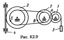 Механизм состоит из ступенчатых колес 1—3, находящихся в зацеплении или связанных ременной передачей, зубчатой рейки 4 и груза 5, привязанного к концу нити, намотанной на одно из колес (рис. К2.0 — К2.9, табл. К2). Радиусы ступеней колес равны соответственно: у колеса 1 – r1 = 2 см, R1 = 4 см, у колеса 2 – r2 = 6 см, R2 = 8 см, у колеса 3 – r3 — 12 см, R3 = 16 см. На ободьях колес расположены точки A, В и С. В столбце «Дано» таблицы указан закон движения или закон изменения скорости ведущего звена механизма, где φ1(t) — закон вращения колеса 1, s2(f) — закон движения рейки 4, ω2(t) — закон изменения угловой скорости колеса 2, v5(t) — закон изменения скорости груза 5 и т. д. (везде φ выражено в радианах, s — в сантиметрах, t — в секундах). Положительное направление для φ и ω против хода часовой стрелки, для s4, s5 и v4, v5 — вниз. Определить в момент времени t1 = 2 с указанные в таблице в столбцах «Найти» скорости (v — линейные, ω — угловые) и ускорения (а — линейные, ε — угловые) соответствующих точек или тел (v5 — скорость груза 5 и т. д.).