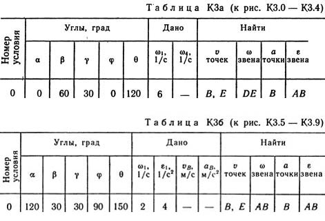 Плоский механизм состоит из стержней 1, 2, 3, 4 и ползуна В или Е (рис. КЗ.0 — К3.7) или из стержней 1, 2, 3 и ползунов В и E (рис. К3.8, К3.9), соединенных друг с другом и с неподвижными опорами O1, O2 шарнирами; точка D находится в середине стержня АВ. Длины стержней равны соответственно l1 = 0,4 м, l2 = 1,2 м, l3 = 1,4 м, l4 = 0,6 м. Положение механизма определяется углами α, β, γ, φ, θ. Значения этих углов и других заданных величин указаны в табл. КЗа (для рис. 0—4) или в табл. КЗб (для рис. 5—9); при этом в табл. КЗа ω1 и ω4 — величины постоянные. Определить величины, указанные в таблицах в столбцах «Найти». Дуговые стрелки на рисунках показывают, как при построении чертежа механизма должны откладываться соответствующие углы: по ходу или против хода часовой стрелки (например, угол γ на рис. 8 следует отложить от DB по ходу часовой стрелки, а на рис. 9 — против хода часовой стрелки и т. д.). Построение чертежа начинать со стержня, направление которого определяется углом α; ползун с направляющими для большей наглядности изобразить так, как в примере КЗ (см. рис. КЗб). Заданные угловую скорость и угловое ускорение считать направленными против часовой стрелки, а заданные скорость vB и ускорение аB — от точки В к b (на рис. 5—9).
