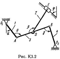 Плоский механизм состоит из стержней 1, 2, 3, 4 и ползуна В или Е (рис. КЗ.0 — К3.7) или из стержней 1, 2, 3 и ползунов В и E (рис. К3.8, К3.9), соединенных друг с другом и с неподвижными опорами O1, O2 шарнирами; точка D находится в середине стержня АВ. Длины стержней равны соответственно l1 = 0,4 м, l2 = 1,2 м, l3 = 1,4 м, l4 = 0,6 м. Положение механизма определяется углами α, β, γ, φ, θ. Значения этих углов и других заданных величин указаны в табл. КЗа (для рис. 0—4) или в табл. КЗб (для рис. 5—9); при этом в табл. КЗа ω1 и ω4 — величины постоянные. Определить величины, указанные в таблицах в столбцах «Найти». Дуговые стрелки на рисунках показывают, как при построении чертежа механизма должны откладываться соответствующие углы: по ходу или против хода часовой стрелки (например, угол γ на рис. 8 следует отложить от DB по ходу часовой стрелки, а на рис. 9 — против хода часовой стрелки и т. д.). Построение чертежа начинать со стержня, направление которого определяется углом α; ползун с направляющими для большей наглядности изобразить так, как в примере КЗ (см. рис. КЗб). Заданные угловую скорость и угловое ускорение считать направленными против часовой стрелки, а заданные скорость vB и ускорение аB — от точки В к b (на рис. 5—9).