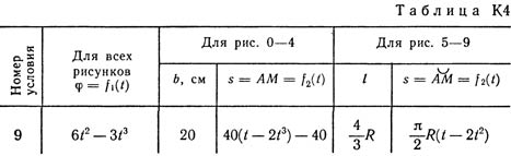Прямоугольная пластина (рис. К4.0 — К4.4) или круглая пластина радиуса R = 60 см (рис. К4.5 — К4.9) вращается вокруг неподвижной оси по закону φ = f1(t), заданному в табл. К4. Положительное направление отсчета угла φ показано на рисунках дуговой стрелкой. На рис. 0, 1, 2, 5, 6 ось вращения перпендикулярна плоскости пластины и проходит через точку О (пластина вращается в своей плоскости); на рис. 3, 4, 7, 8, 9 ось вращения OO1 лежит в плоскости пластины (пластина вращается в пространстве). По пластине вдоль прямой BD (рис. 0—4) или по окружности радиуса R (рис. 5—9) движется точка М; закон ее относительного движения, т. е. зависимость s = AM = f2(t) (s выражено в сантиметрах, t — в секундах), задан в таблице отдельно для рис. 0—4 и для рис. 5—9; там же даны размеры b и l. На рисунках точка М показана в положении, при котором s = АМ>0 (при s<0 точка М находится по другую сторону от точки А). Найти абсолютную скорость и абсолютное ускорение точки М в момент времени t1 = 1 с.