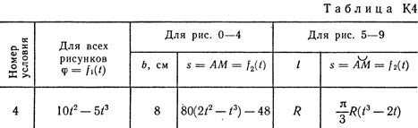 Прямоугольная пластина (рис. К4.0 — К4.4) или круглая пластина радиуса R = 60 см (рис. К4.5 — К4.9) вращается вокруг неподвижной оси по закону φ = f1(t), заданному в табл. К4. Положительное направление отсчета угла φ показано на рисунках дуговой стрелкой. На рис. 0, 1, 2, 5, 6 ось вращения перпендикулярна плоскости пластины и проходит через точку О (пластина вращается в своей плоскости); на рис. 3, 4, 7, 8, 9 ось вращения OO1 лежит в плоскости пластины (пластина вращается в пространстве). По пластине вдоль прямой BD (рис. 0—4) или по окружности радиуса R (рис. 5—9) движется точка М; закон ее относительного движения, т. е. зависимость s = AM = f2(t) (s выражено в сантиметрах, t — в секундах), задан в таблице отдельно для рис. 0—4 и для рис. 5—9; там же даны размеры b и l. На рисунках точка М показана в положении, при котором s = АМ>0 (при s<0 точка М находится по другую сторону от точки А). Найти абсолютную скорость и абсолютное ускорение точки М в момент времени t1 = 1 с.