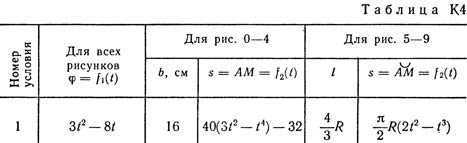 Прямоугольная пластина (рис. К4.0 — К4.4) или круглая пластина радиуса R = 60 см (рис. К4.5 — К4.9) вращается вокруг неподвижной оси по закону φ = f1(t), заданному в табл. К4. Положительное направление отсчета угла φ показано на рисунках дуговой стрелкой. На рис. 0, 1, 2, 5, 6 ось вращения перпендикулярна плоскости пластины и проходит через точку О (пластина вращается в своей плоскости); на рис. 3, 4, 7, 8, 9 ось вращения OO1 лежит в плоскости пластины (пластина вращается в пространстве). По пластине вдоль прямой BD (рис. 0—4) или по окружности радиуса R (рис. 5—9) движется точка М; закон ее относительного движения, т. е. зависимость s = AM = f2(t) (s выражено в сантиметрах, t — в секундах), задан в таблице отдельно для рис. 0—4 и для рис. 5—9; там же даны размеры b и l. На рисунках точка М показана в положении, при котором s = АМ>0 (при s<0 точка М находится по другую сторону от точки А). Найти абсолютную скорость и абсолютное ускорение точки М в момент времени t1 = 1 с.