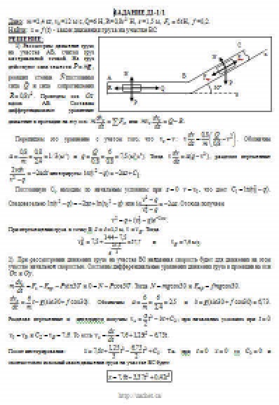 Груз D массой m, получив в точке A начальную скорость v0 движется в изогнутой трубе AВС, расположенной в вертикальной плоскости; участки трубы или оба наклонные, или один горизонтальный, а другой наклонный (рис. Д1.0 — Д1.9, табл. Д1). На участке AВ на груз кроме силы тяжести действуют постоянная сила Q (ее направление показано на рисунках) и сила сопротивления среды R, зависящая от скорости v груза (направлена против движения); трением груза о трубу на участке AВ пренебречь. В точке В груз, не изменяя своей скорости, переходит на участок ВС трубы, где на него кроме силы тяжести действуют сила трения (коэффициент трения груза о трубу f = 0,2) и переменная сила F, проекция которой Fx на ось х задана в таблице. Считая груз материальной точкой и зная расстояние AВ = l или время t1 движения груза от точки А до точки В, найти закон движения груза на участке ВС, т. е. х = f(t), где х = BD.