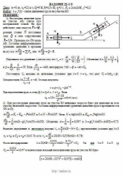 Груз D массой m, получив в точке A начальную скорость v0 движется в изогнутой трубе AВС, расположенной в вертикальной плоскости; участки трубы или оба наклонные, или один горизонтальный, а другой наклонный (рис. Д1.0 — Д1.9, табл. Д1). На участке AВ на груз кроме силы тяжести действуют постоянная сила Q (ее направление показано на рисунках) и сила сопротивления среды R, зависящая от скорости v груза (направлена против движения); трением груза о трубу на участке AВ пренебречь. В точке В груз, не изменяя своей скорости, переходит на участок ВС трубы, где на него кроме силы тяжести действуют сила трения (коэффициент трения груза о трубу f = 0,2) и переменная сила F, проекция которой Fx на ось х задана в таблице. Считая груз материальной точкой и зная расстояние AВ = l или время t1 движения груза от точки А до точки В, найти закон движения груза на участке ВС, т. е. х = f(t), где х = BD.