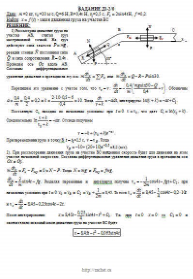 Груз D массой m, получив в точке A начальную скорость v0 движется в изогнутой трубе AВС, расположенной в вертикальной плоскости; участки трубы или оба наклонные, или один горизонтальный, а другой наклонный (рис. Д1.0 — Д1.9, табл. Д1). На участке AВ на груз кроме силы тяжести действуют постоянная сила Q (ее направление показано на рисунках) и сила сопротивления среды R, зависящая от скорости v груза (направлена против движения); трением груза о трубу на участке AВ пренебречь. В точке В груз, не изменяя своей скорости, переходит на участок ВС трубы, где на него кроме силы тяжести действуют сила трения (коэффициент трения груза о трубу f = 0,2) и переменная сила F, проекция которой Fx на ось х задана в таблице. Считая груз материальной точкой и зная расстояние AВ = l или время t1 движения груза от точки А до точки В, найти закон движения груза на участке ВС, т. е. х = f(t), где х = BD.