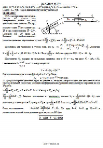Груз D массой m, получив в точке A начальную скорость v0 движется в изогнутой трубе AВС, расположенной в вертикальной плоскости; участки трубы или оба наклонные, или один горизонтальный, а другой наклонный (рис. Д1.0 — Д1.9, табл. Д1). На участке AВ на груз кроме силы тяжести действуют постоянная сила Q (ее направление показано на рисунках) и сила сопротивления среды R, зависящая от скорости v груза (направлена против движения); трением груза о трубу на участке AВ пренебречь. В точке В груз, не изменяя своей скорости, переходит на участок ВС трубы, где на него кроме силы тяжести действуют сила трения (коэффициент трения груза о трубу f = 0,2) и переменная сила F, проекция которой Fx на ось х задана в таблице. Считая груз материальной точкой и зная расстояние AВ = l или время t1 движения груза от точки А до точки В, найти закон движения груза на участке ВС, т. е. х = f(t), где х = BD.