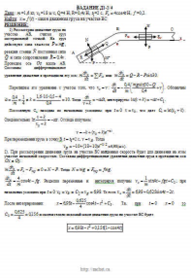 Груз D массой m, получив в точке A начальную скорость v0 движется в изогнутой трубе AВС, расположенной в вертикальной плоскости; участки трубы или оба наклонные, или один горизонтальный, а другой наклонный (рис. Д1.0 — Д1.9, табл. Д1). На участке AВ на груз кроме силы тяжести действуют постоянная сила Q (ее направление показано на рисунках) и сила сопротивления среды R, зависящая от скорости v груза (направлена против движения); трением груза о трубу на участке AВ пренебречь. В точке В груз, не изменяя своей скорости, переходит на участок ВС трубы, где на него кроме силы тяжести действуют сила трения (коэффициент трения груза о трубу f = 0,2) и переменная сила F, проекция которой Fx на ось х задана в таблице. Считая груз материальной точкой и зная расстояние AВ = l или время t1 движения груза от точки А до точки В, найти закон движения груза на участке ВС, т. е. х = f(t), где х = BD.